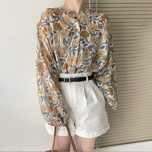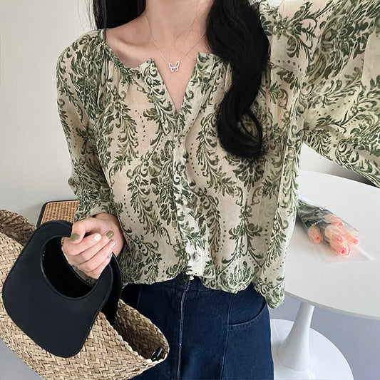 【トップス】春秋 Vネック 花柄 日焼け止め 長袖 レトロ シャツ【JZシリーズ】
