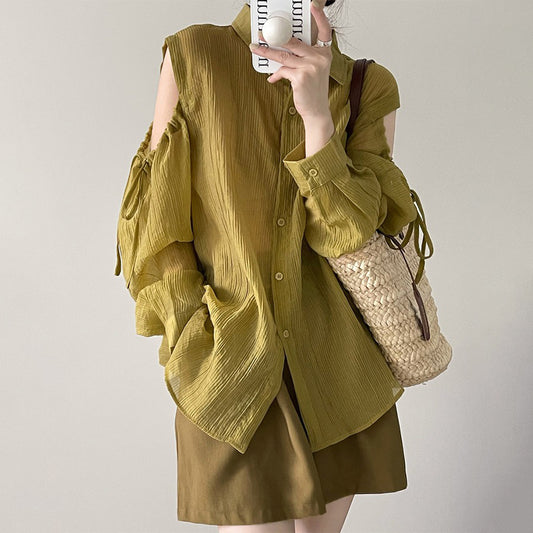 【トップス】春夏秋 無地 薄手 オフショルダー ルーズ 日焼け止め シャツ【JZシリーズ】