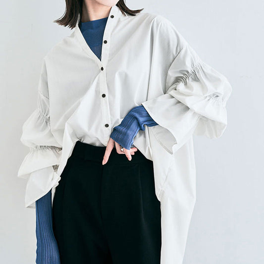 【トップス】春秋 ゆったり 無地 ミドル丈 ランタンスリーブ シャツ
