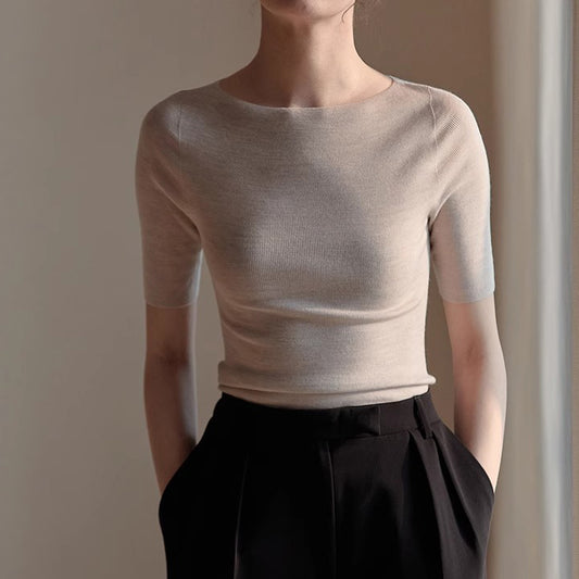 【トップス】トレンド入り 夏 無地 ラウンドネック 薄手 ニット Tシャツ