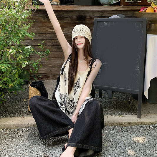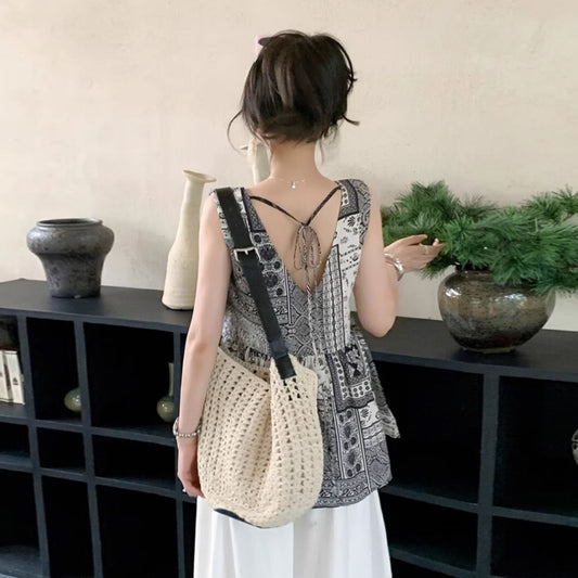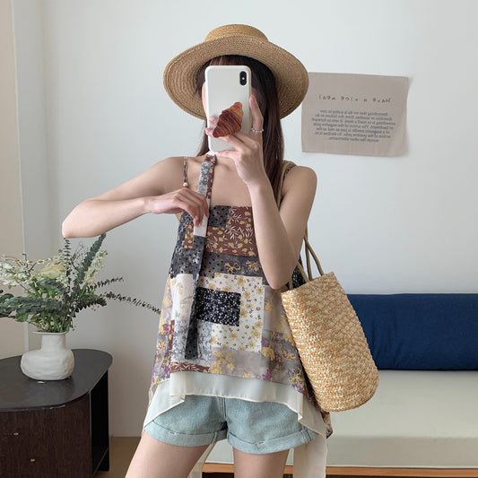 【トップス】夏 リゾート風ヴィンテージ柄キャミトップス 不規則シルエット×ゆったりデザインで抜け感たっぷり【SHシリーズ】