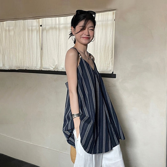【トップス】夏 フレンチVネック ストライプキャミソール ゆったりシルエット×バックオープンが大人映え【SHシリーズ】