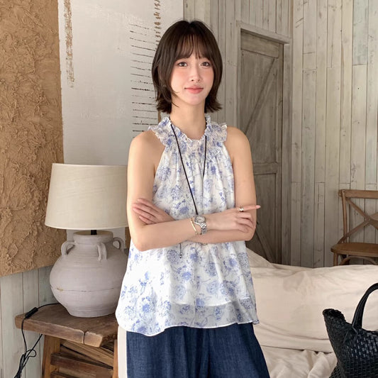 【トップス】ヴィンテージ風水墨プリント フリルネックホルタートップス 夏 シフォン素材【SHシリーズ】