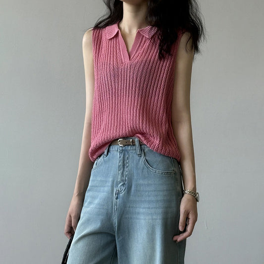 【トップス】夏用 薄手ノースリーブ ポロ襟透かし編みシアーニットベスト【JZシリーズ】