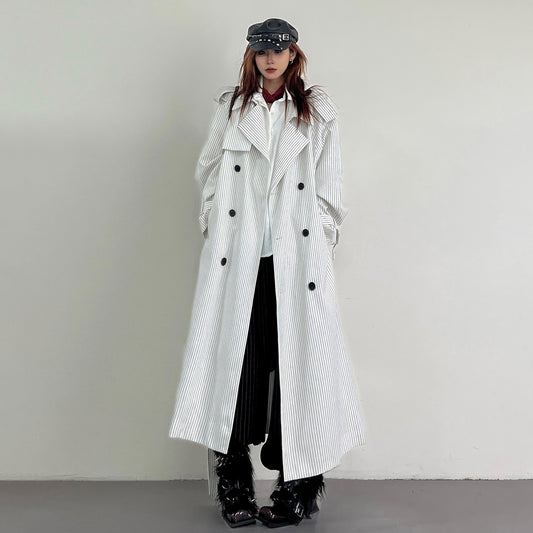 【アウター】韓国風 ストライプ ダブルボタン ベルト付き ロングトレンチコート【FCシリーズ】【10~15日内発送】