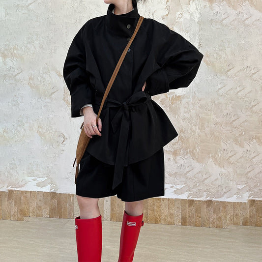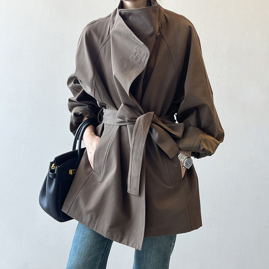 【アウター】ブリティッシュスタイル スタンドカラー トレンチコート レディース 秋 ゆったり カジュアル ベルト付きウエストマーク ショートコート【JZシリーズ】