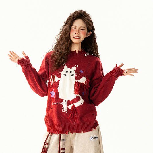 【トップス】アメリカンレトロ 猫モチーフ 猫柄 ネコ クルーネック ニット ルーズ 秋新作【FCシリーズ】