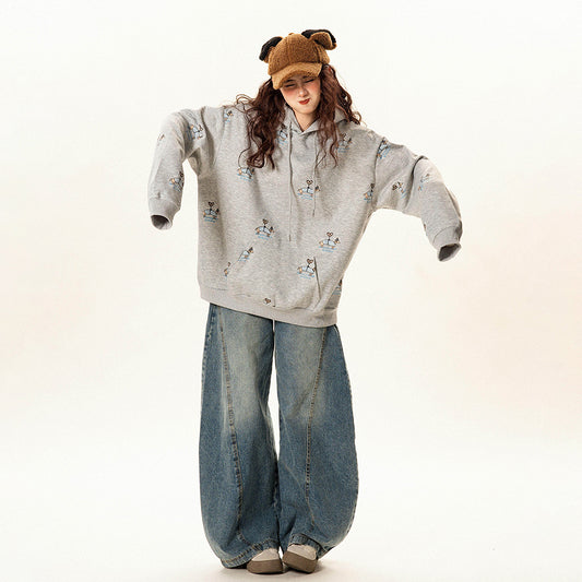 【トップス】ヴィンテージ調 小犬モチーフ フードパーカー 春秋 男女兼用 ゆったり カジュアル【FCシリーズ】