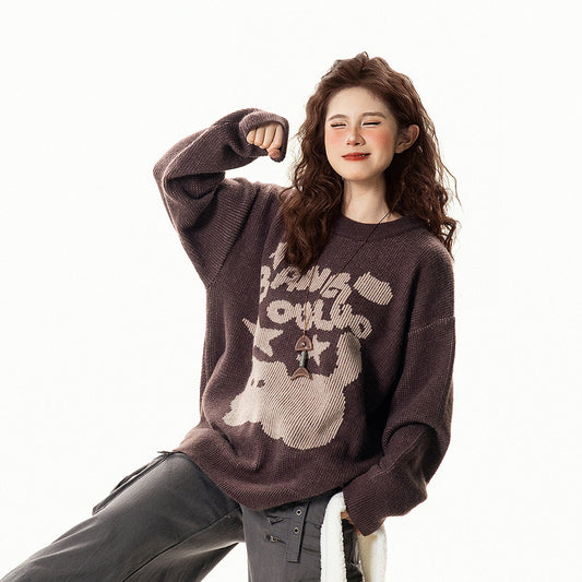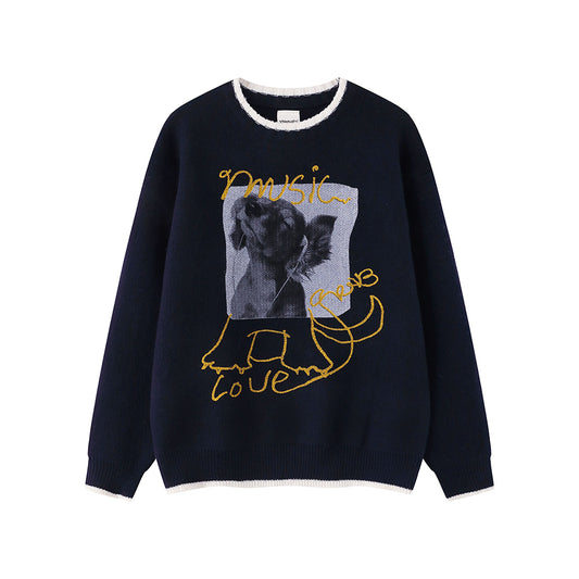 【トップス】レトロ デザイン 小犬柄 クルーネック ニット レディース ゆったり ルーズ 着回し セーター【FCシリーズ】