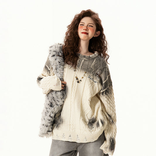 【トップス】ヴィンテージ風 デザイン グラデーション タイダイ ダメージ ニット レディース 秋冬 ゆったり 着回し セーター【FCシリーズ】