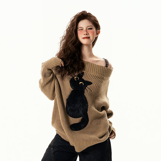【トップス】遊び心 猫モチーフ ワンショルダーニット 猫柄 ゆったり リラックス感 ニットトップス【FCシリーズ】
