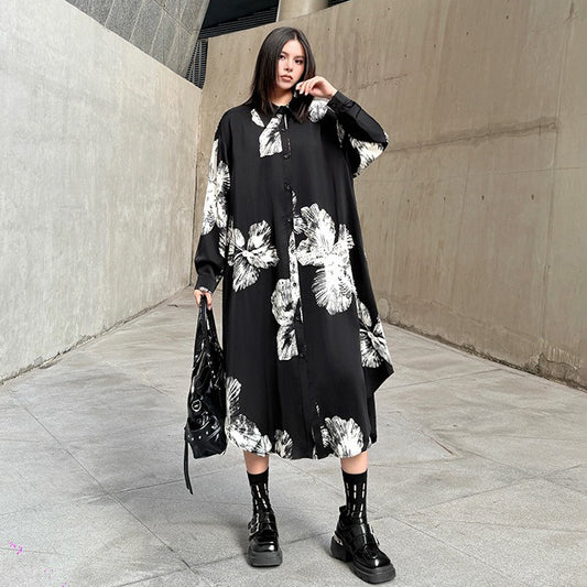 【ワンピース】香港風 クルーネック 切替 シャツ生地 大きめサイズ 長袖 ワンピース ビッグシルエット ゆったり【JZシリーズ】