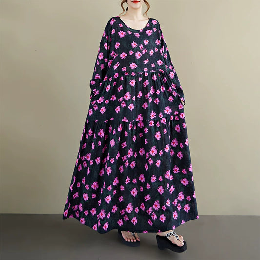 【ワンピース】レトロ 花柄プリント 長袖 ロング Aライン ゆったり 裾フレア ワンピース【SHシリーズ】