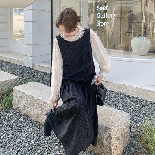 【セットアップ】ベストワンピース×レース切替シャツ セットアップ 韓国シック 上品【JZシリーズ】