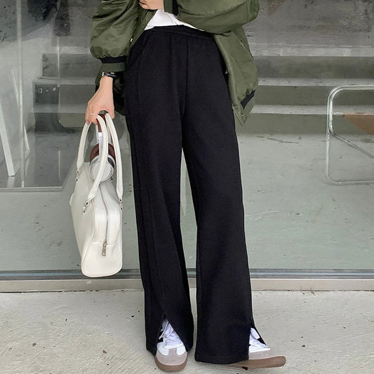 【ボトムス】春秋冬 スリット ウエストゴム入り ワイドパンツ