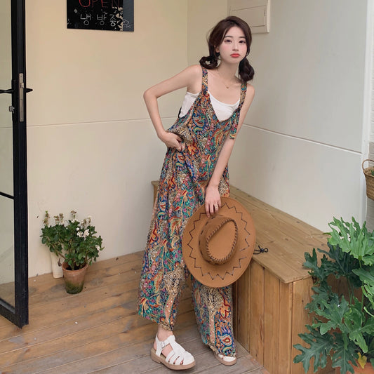 【ボトムス】ゆったりラフ感 オーバーサイズ サロペット 夏新作 アート水墨プリント ワイドパンツオールインワン【SHシリーズ】