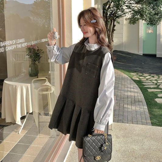 2点セット!【セットアップ】ベスト重ね着風 ロングワンピース 2点セット 春秋 韓国スタイル フレッシュ可愛い 学院風【SHシリーズ】