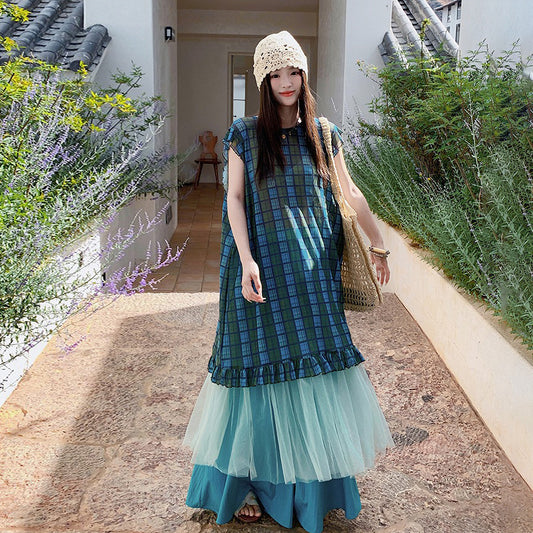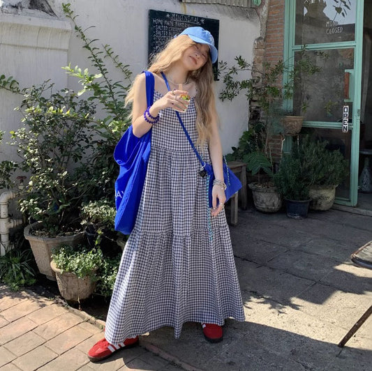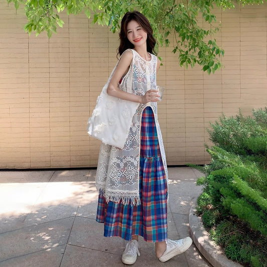 2点セット!【セットアップ】夏新作 レトロ感漂う メッシュカーディガン+チェックキャミワンピース 重ね着2点セット【SHシリーズ】