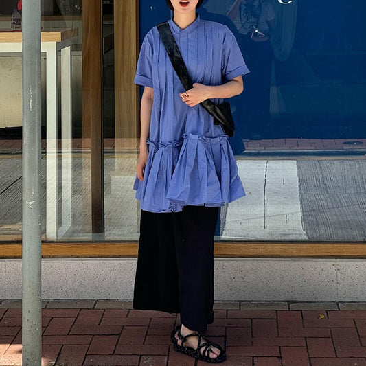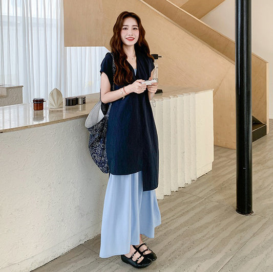 【セットアップ】【単品注文】夏 プリーツ 半袖ワンピース + ゆったり パンツ 2点 上下セット