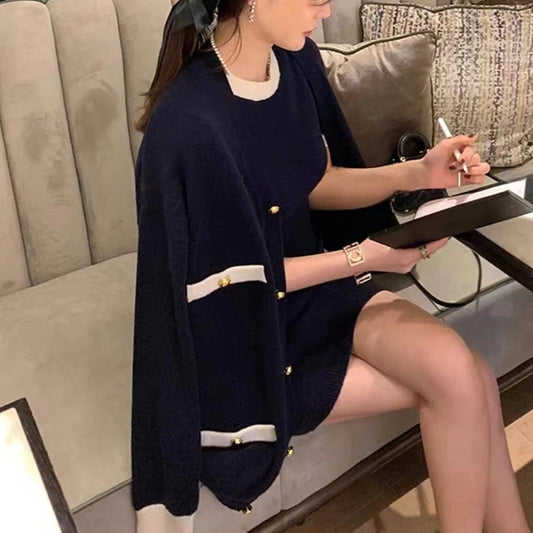 【セットアップ】春秋冬 エレガント ニット ワンピース + ゆるリラックス カーディガン 2点ワンピースセット