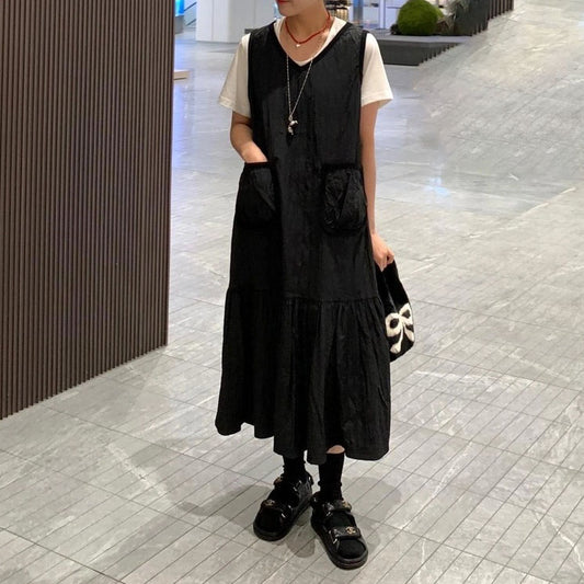 2点セット!【セットアップ】韓国風シンプル Tシャツ+ノースリーブワンピースセット 体型カバーも叶うゆったり大人コーデ【JZシリーズ】