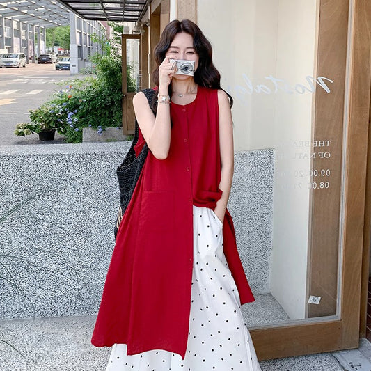 2点セット!【セットアップ】赤ノースリーブロングジレワンピース+ドットワイドパンツ 上下セットアップ 夏コーデ【JZシリーズ】