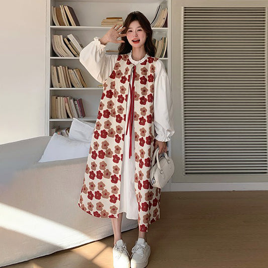2点セット!【セットアップ】 ニットベスト×花柄 長袖ワンピース フレンチ風 リボン付き 若見えロング丈 セット【SHシリーズ】