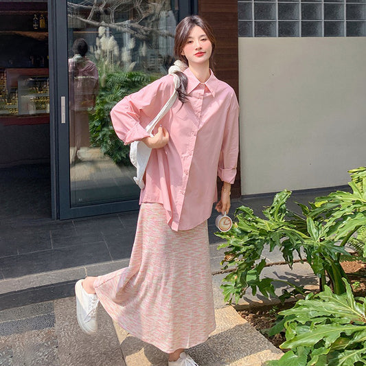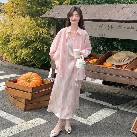 2点セット!【セットアップ】リゾート風 ピンクシャツ+ノースリーブワンピース セットアップ レディース 優しげ雰囲気 おしゃれ映え【SHシリーズ】