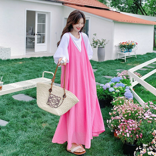 2点セット!【セットアップ】夏 ドーパミンカラー おしゃれレイヤード ゆったりTシャツ+ピンクキャミワンピース 2点セット【JZシリーズ】