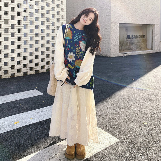 2点セット!【セットアップ】ニットベスト+ワンピース セット レディース 春秋 大人気 レースジャカード ロングワンピース【SHシリーズ】