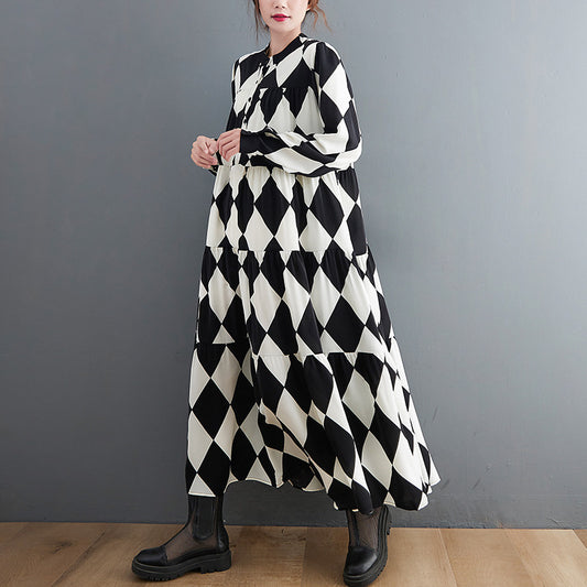 【ワンピース】ブラック&ホワイト ブラック&ホワイト プリント 長袖 ワンピース 【SHシリーズ】