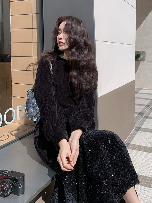 【ワンピース】オードリー風 ベロア 春 秋 冬 スパンコール 長袖 ワンピース【JZシリーズ】