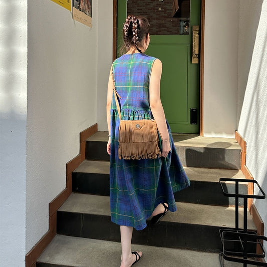 【ワンピース】夏 レトロ Vネック チェック柄 ノースリーブ ワンピース