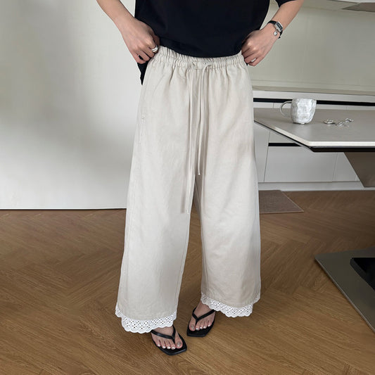 【ボトムス】カジュアル 夏 ウエストゴム レースフリル切り替え 9分丈パンツ【JZシリーズ】