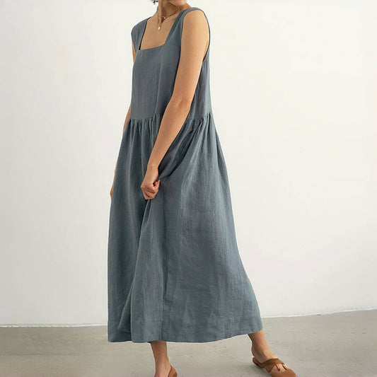 【ワンピース】夏 綿麻 スクエアネック ゆったり カジュアル ノースリーブワンピース