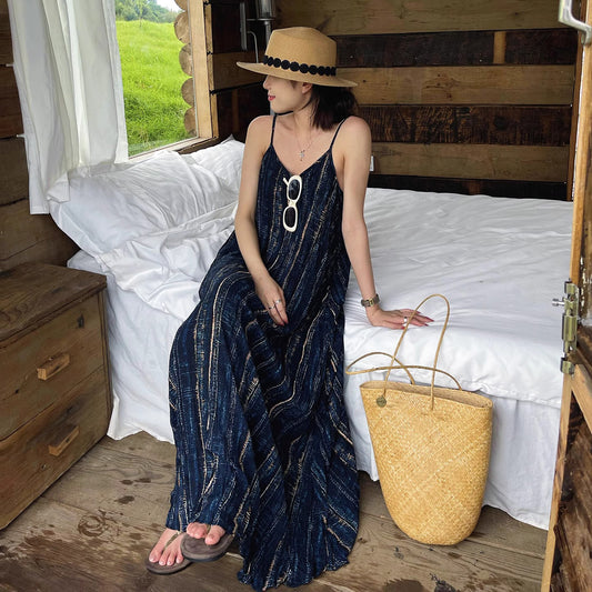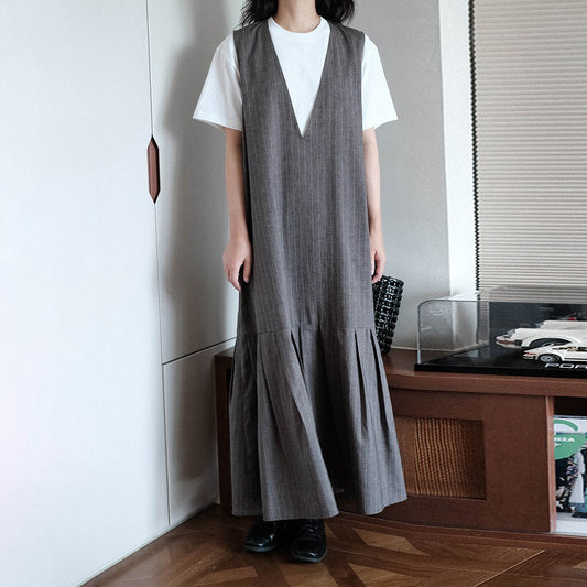 【ワンピース】夏 ルーズ ストライプ柄 Vネック ベスト ロングドレス ノースリーブ【JZシリーズ】