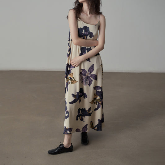 【ワンピース】夏 レトロ サテン 花柄 ゆったり 着痩せ ノースリーブワンピース【SHシリーズ】