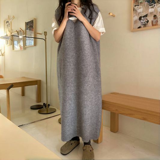【ワンピース】春秋夏 ニット Vネック ノースリーブ ワンピース