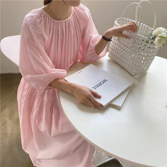 【ワンピース】夏 無地 Aライン ギャザー 半袖ワンピース