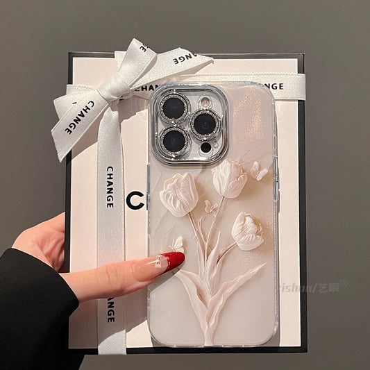 【グッズ】iPhone 16 Pro Max / 15 Pro / 14 PM / 13 / 12 / 11 PM 用 春新作 淡いピンク クリームカラー チューリップ 全面保護 レンズカバー付き 高級感 小众 レディース ストラップ付き