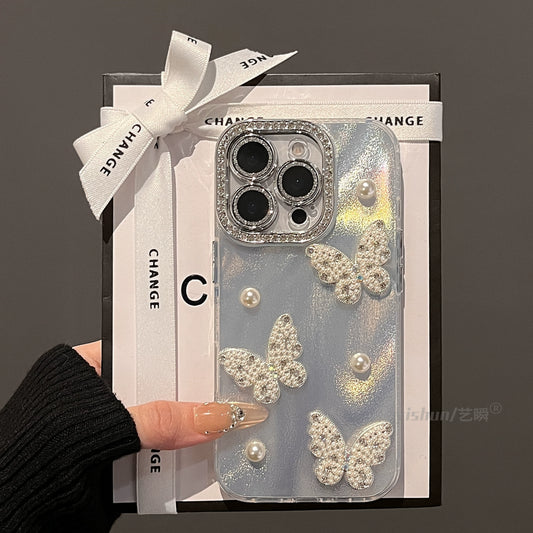 【グッズ】iPhone 16 Pro Max / 15 Pro / 14 Plus / 13 / 12 Pro / 11 用 高級感 ラグジュアリー 新作 立体パール 蝶モチーフ キラキラ ミラーケース レディース スマホカバー