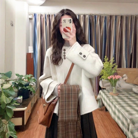 【セットアップ】ふんわりウール斜めボタン切り替えトップス+ハイウエストスカート 上下セット【JZシリーズ】