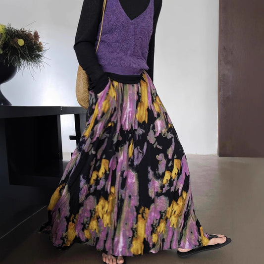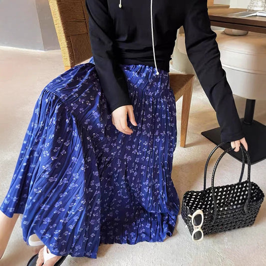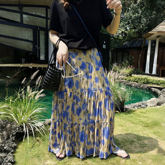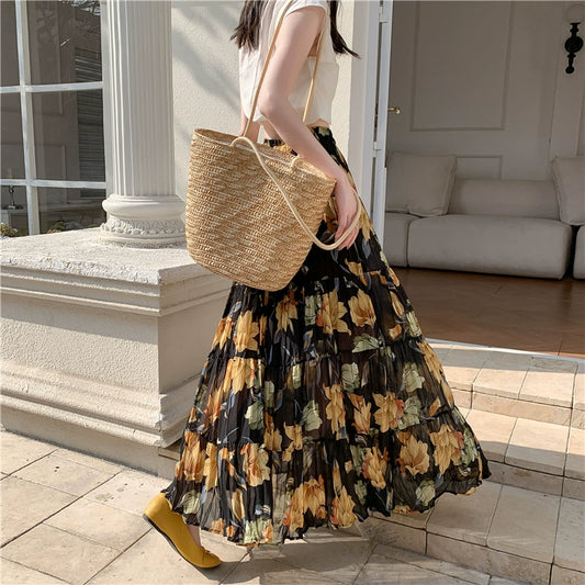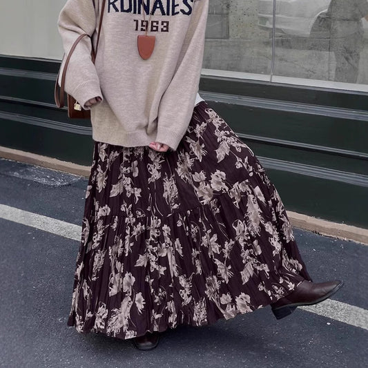 【ボトムス】レトロ花柄スカート レディース ゆったり体型カバー 大きめフレア ロング プリーツスカート【SHシリーズ】