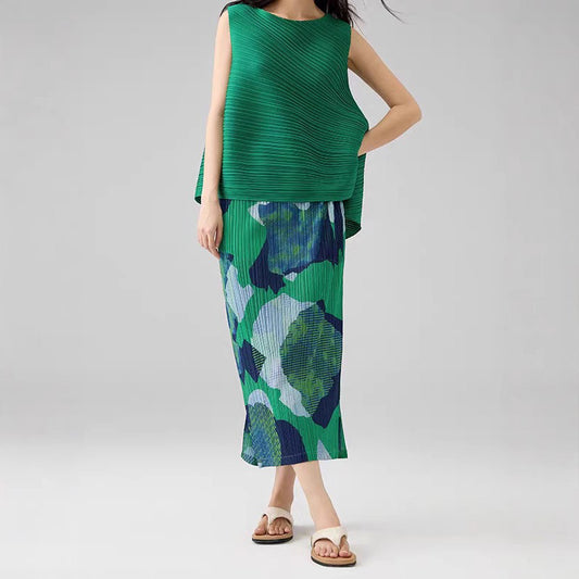 【ボトムス】気質高ウエスト ゴムウエスト プリーツグリーンプリントスカート【SHシリーズ】