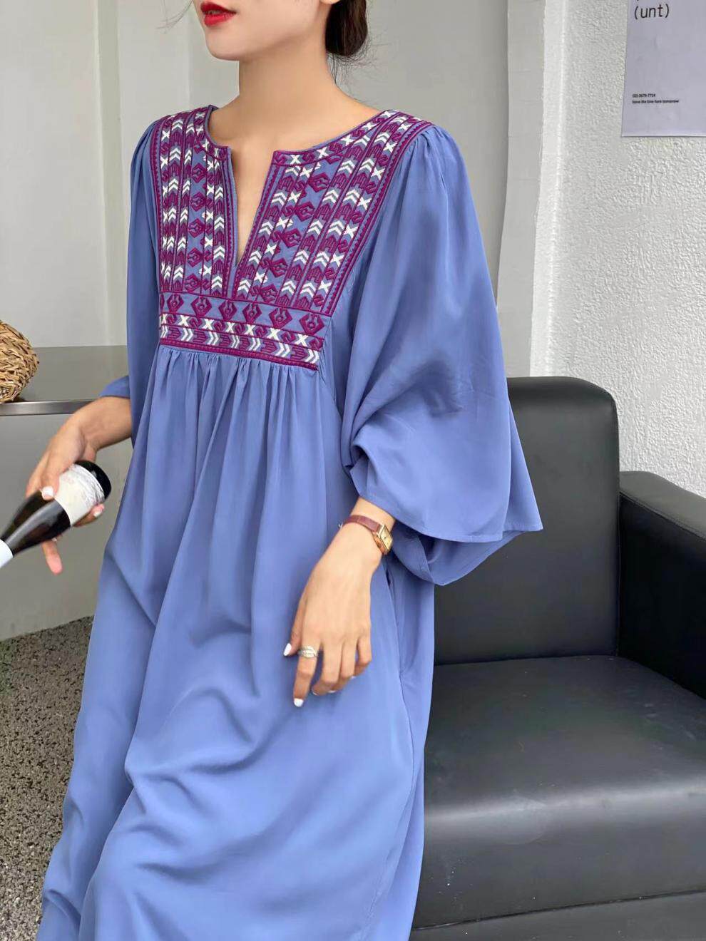 【ワンピース】夏 レトロ ゆったり 大きいサイズ 刺繍 ロング 長袖ワンピース