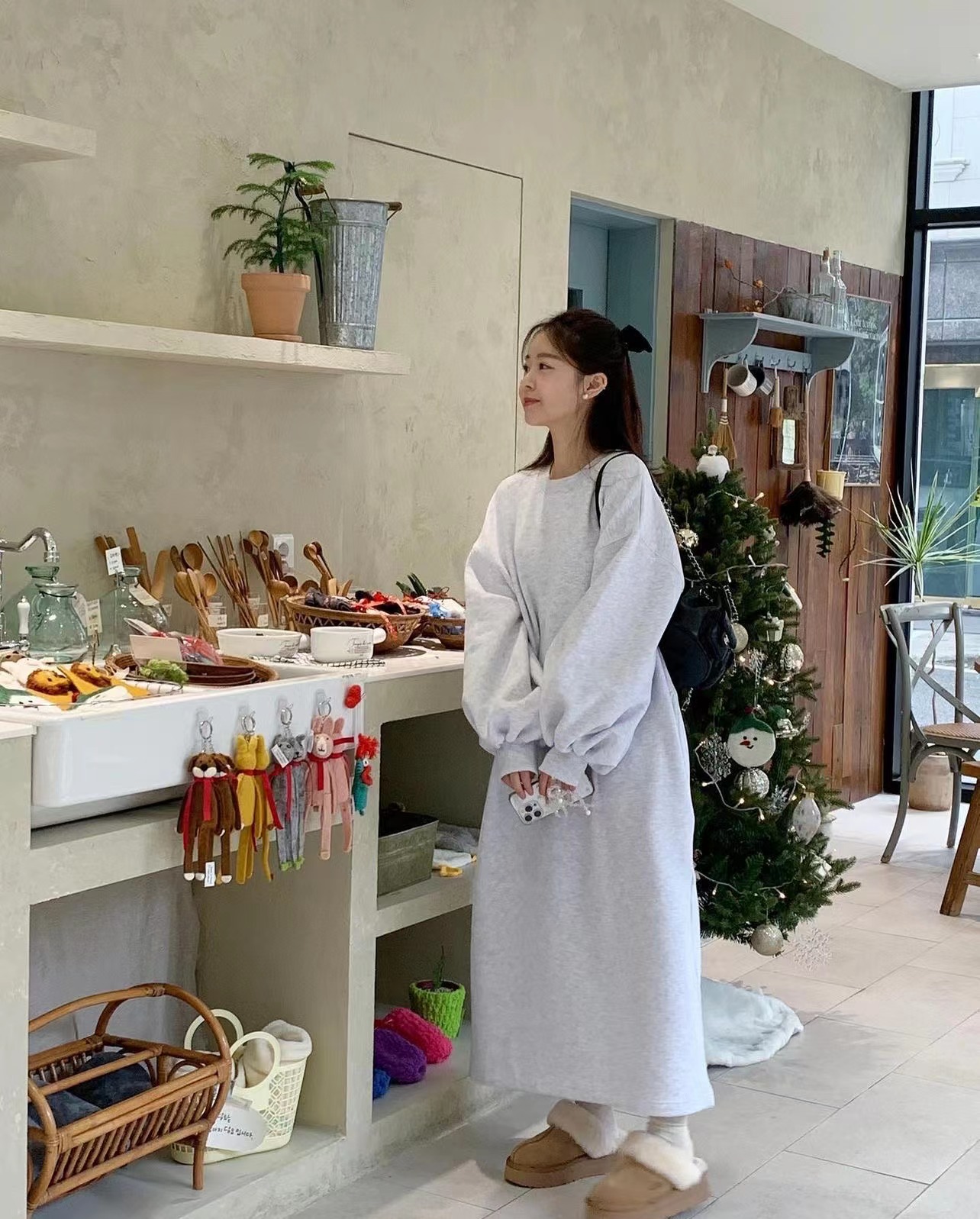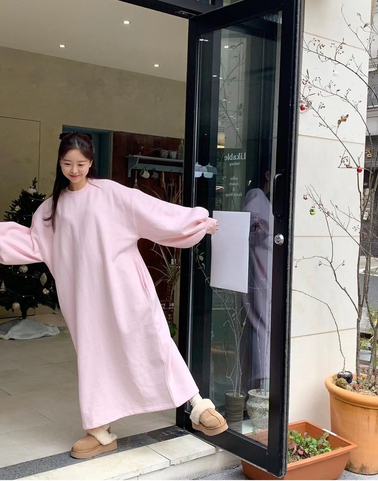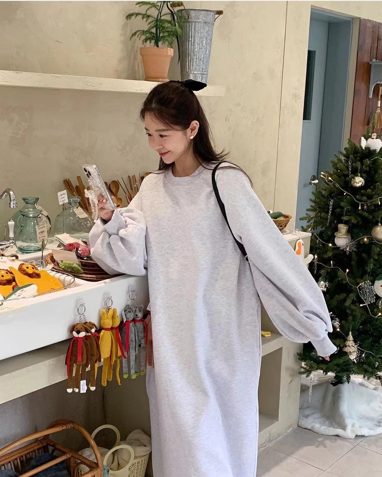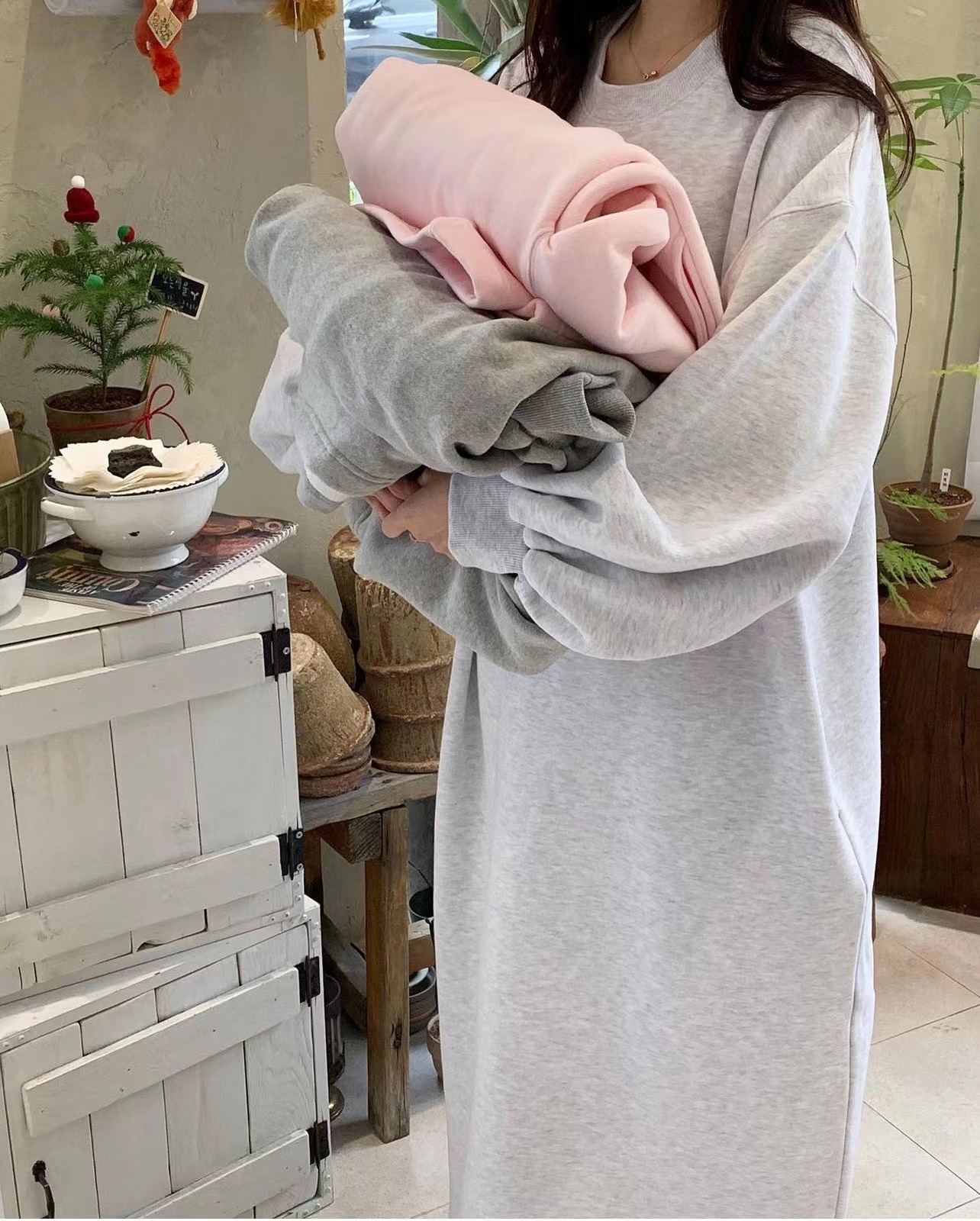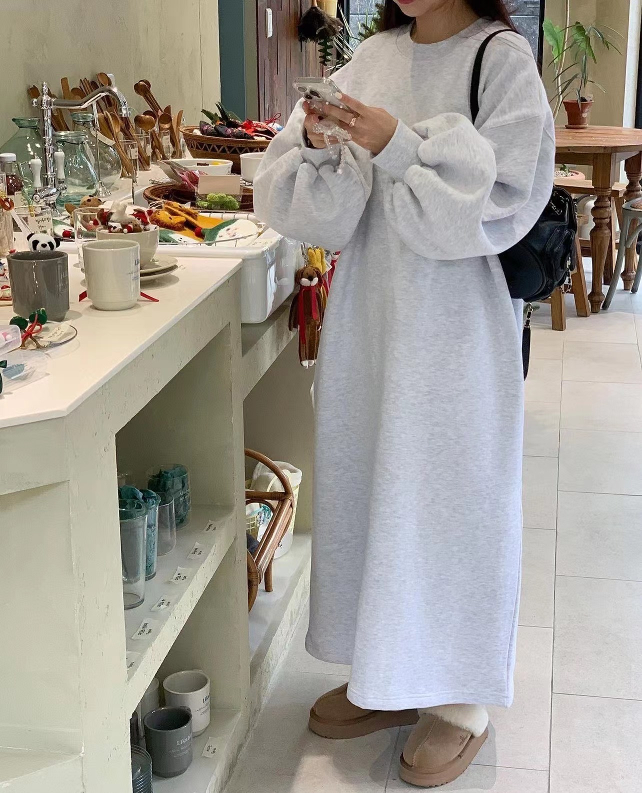 【ワンピース】春秋冬 ラウンドネック ルーズ カジュアル 裏起毛 長袖ワンピース