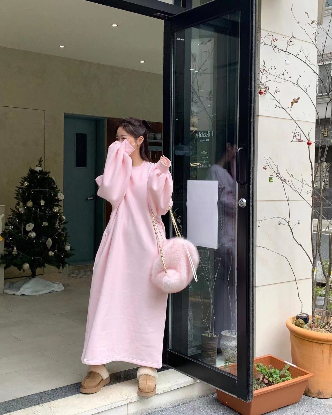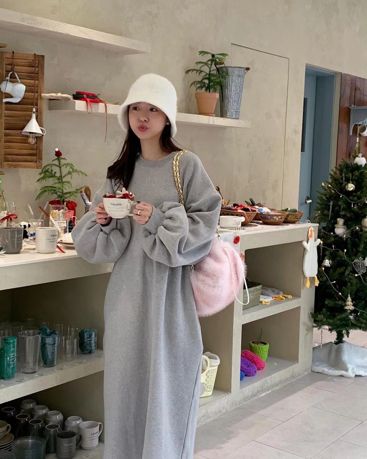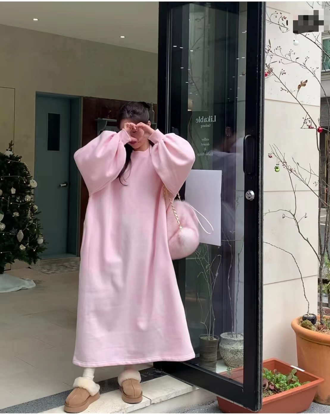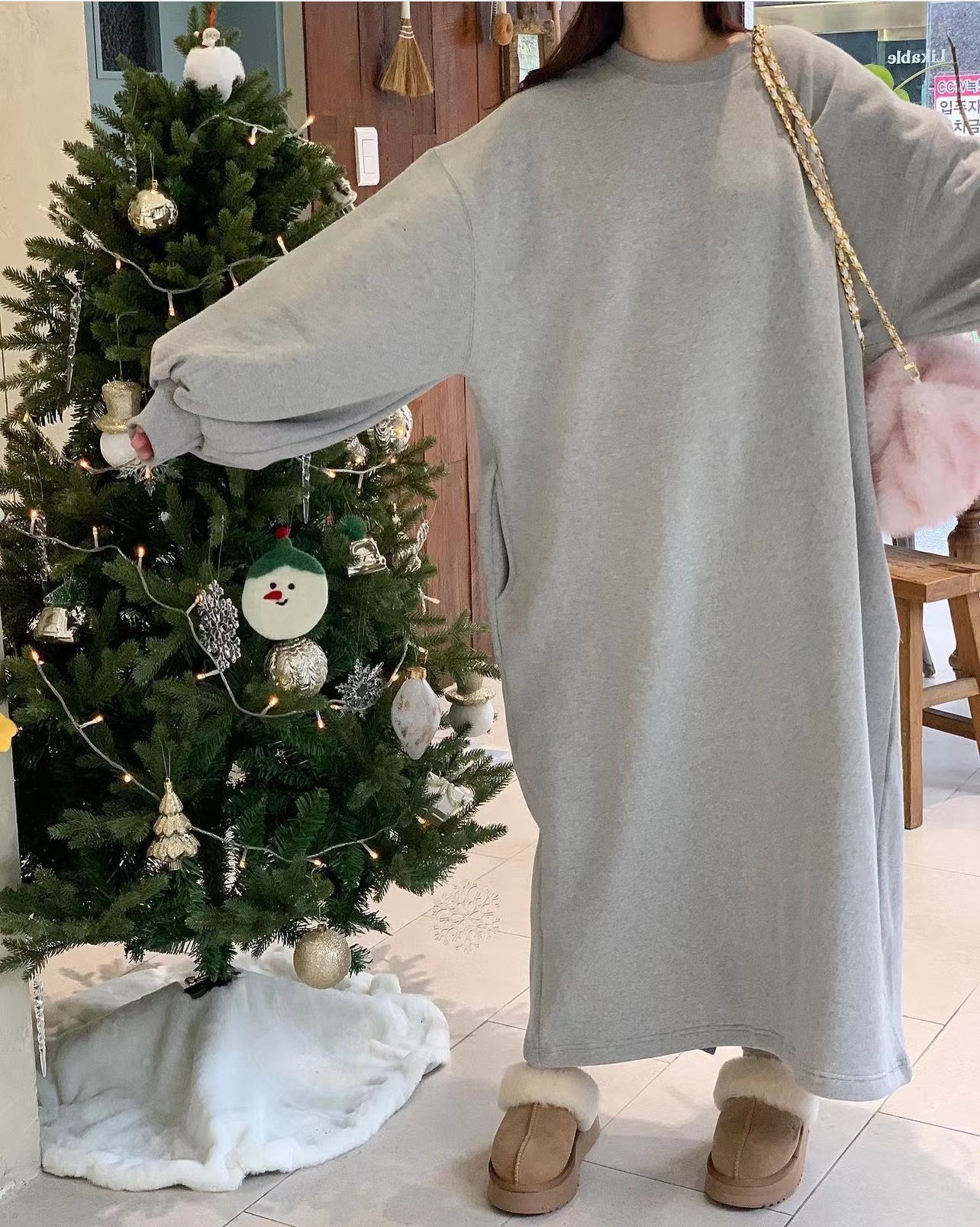【ワンピース】春秋冬 ラウンドネック ルーズ カジュアル 裏起毛 長袖ワンピース