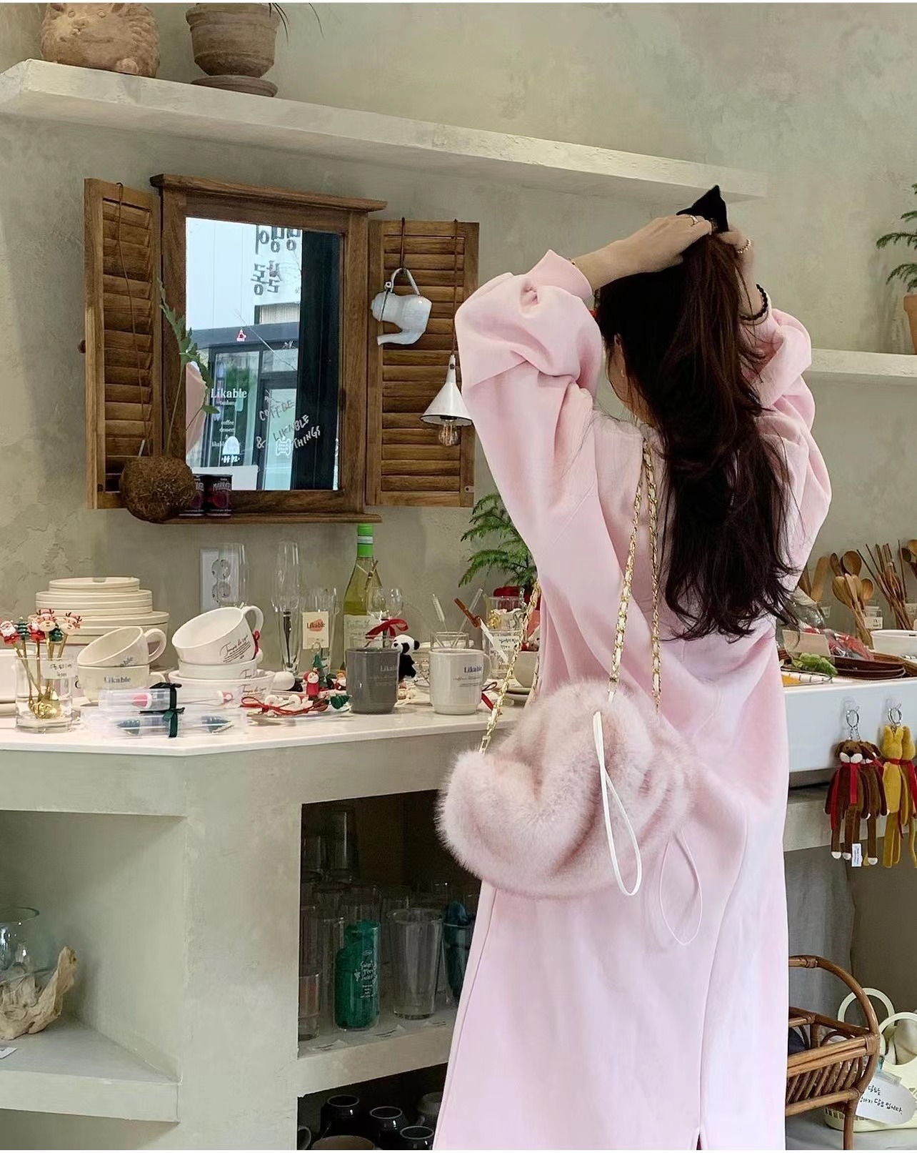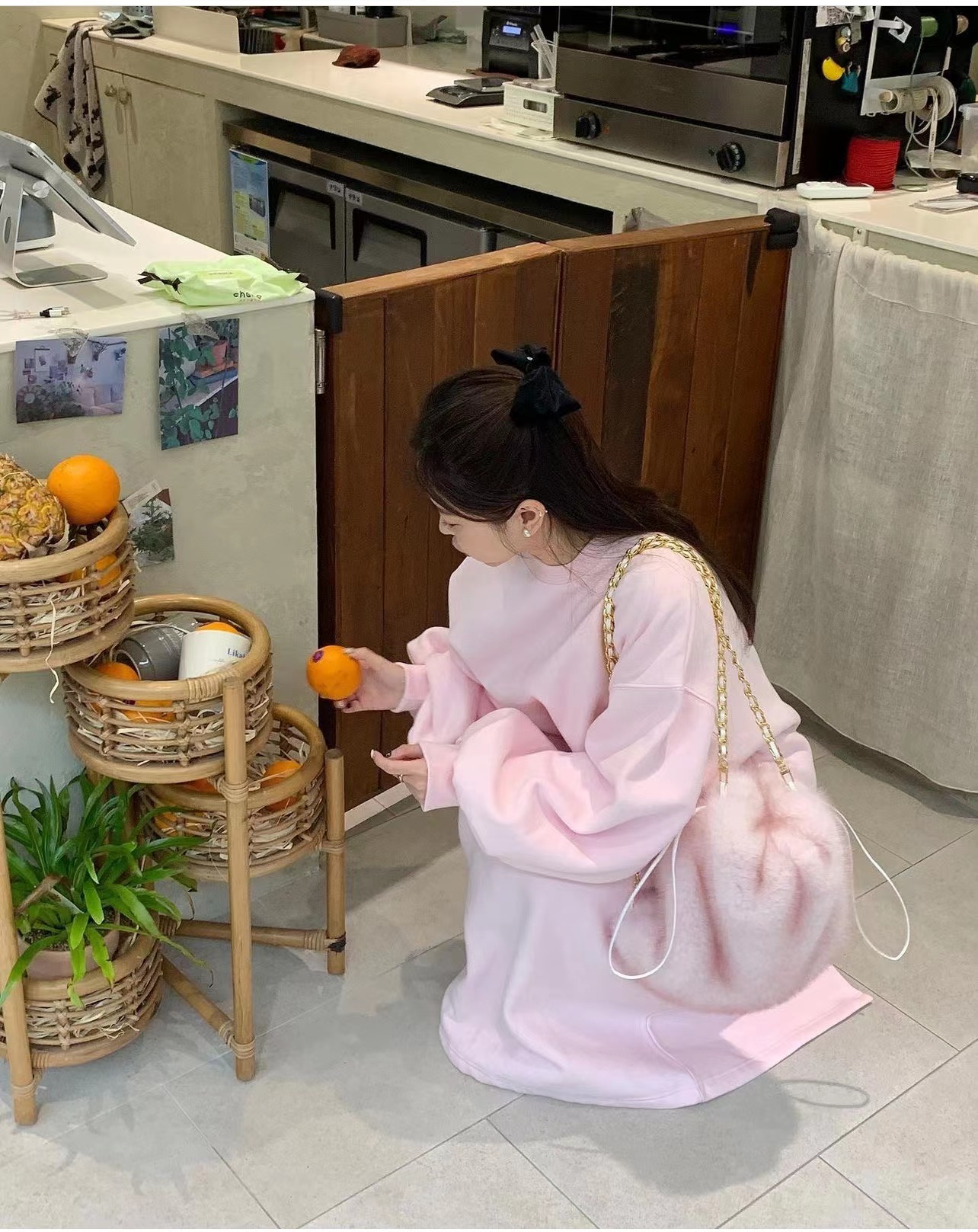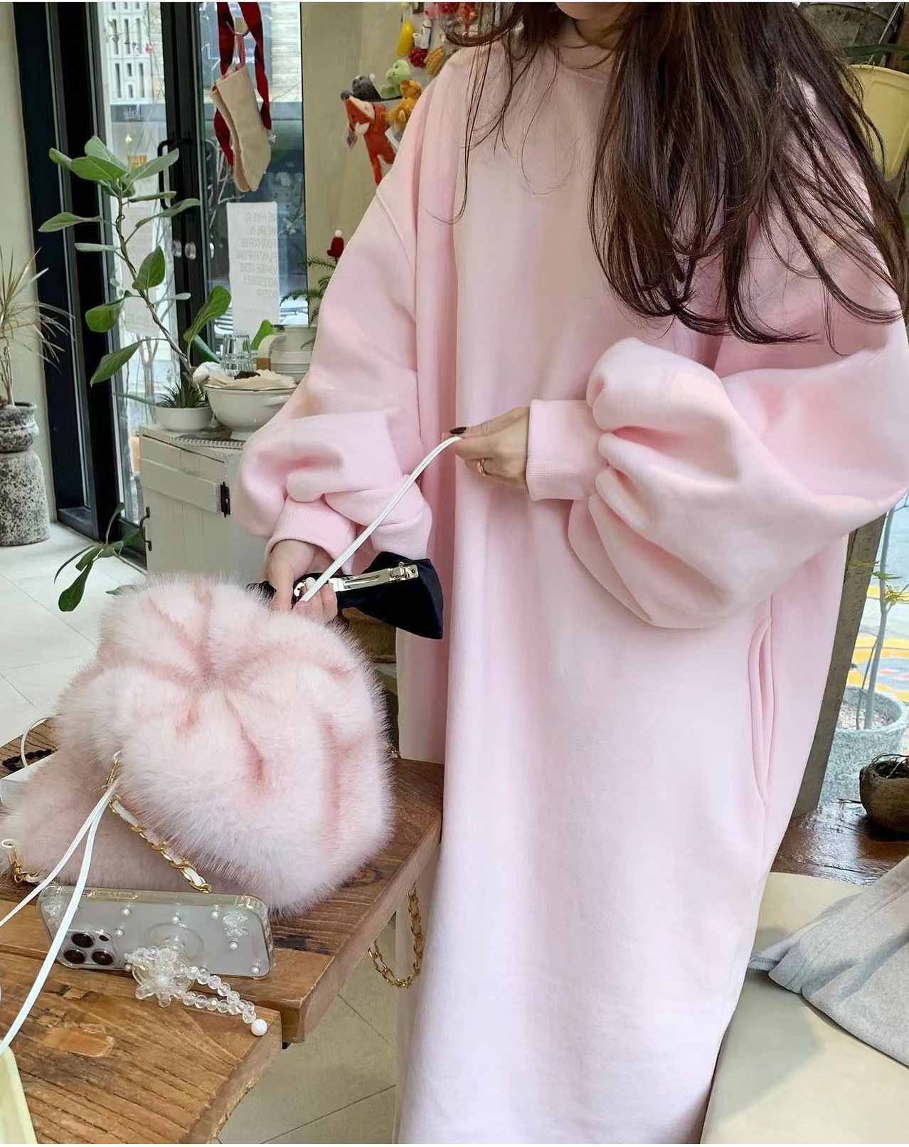 【商品名】【ワンピース】ラウンドネック ルーズ カジュアル 裏起毛 長袖ワンピース