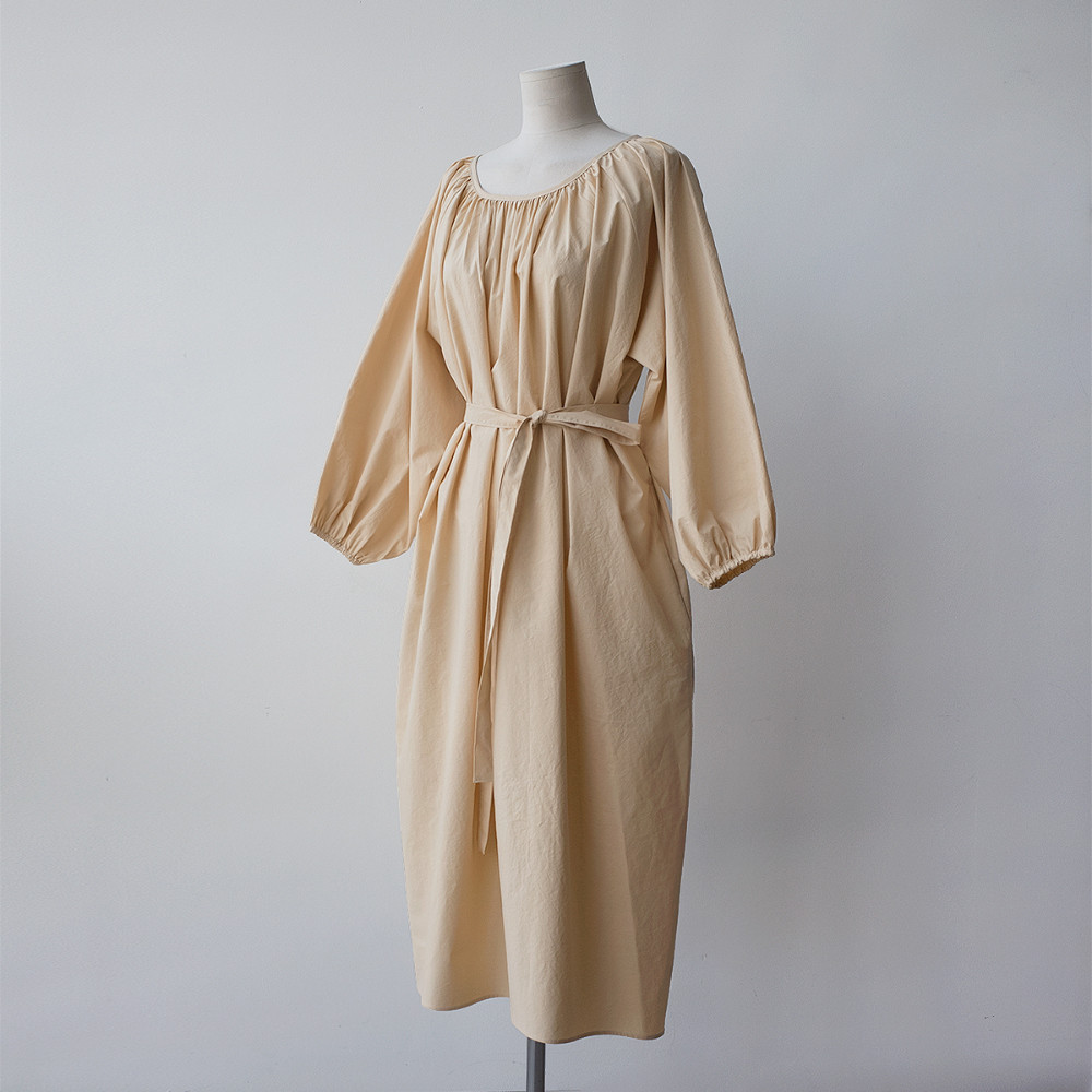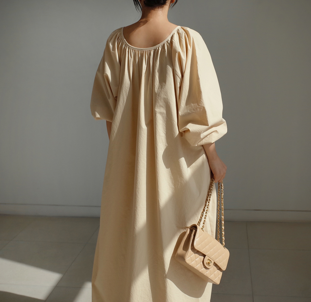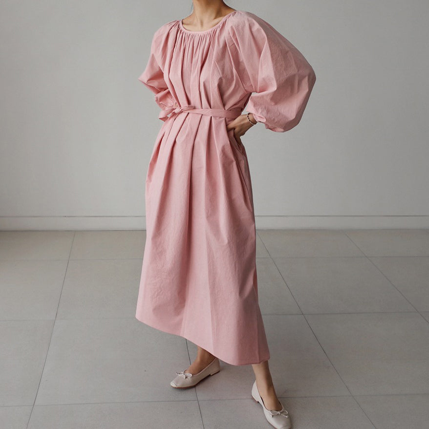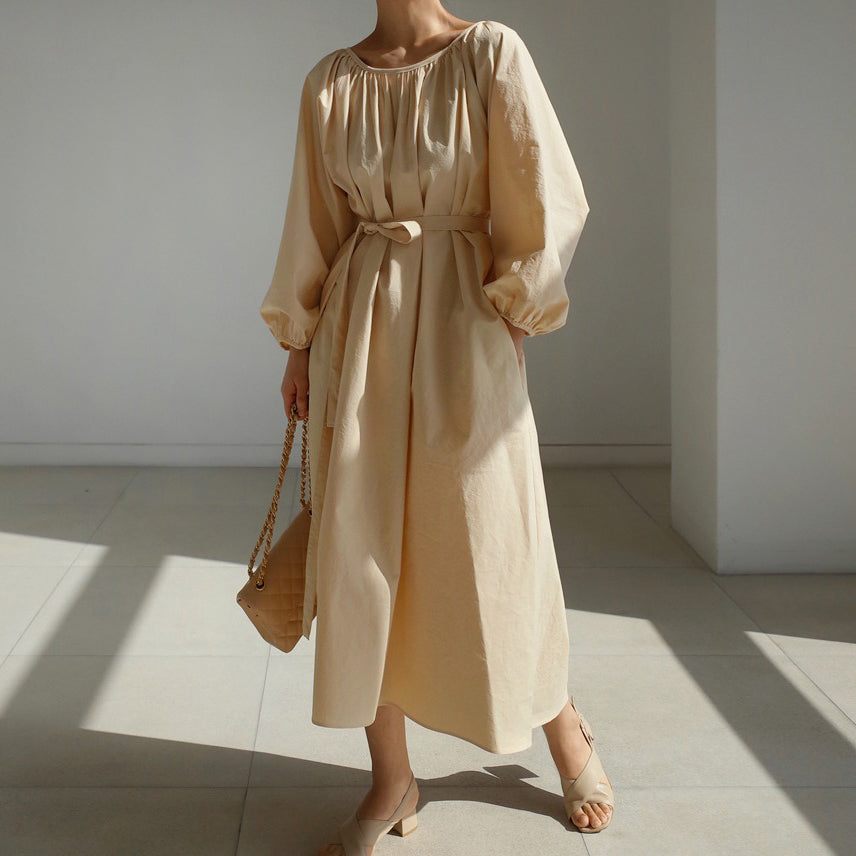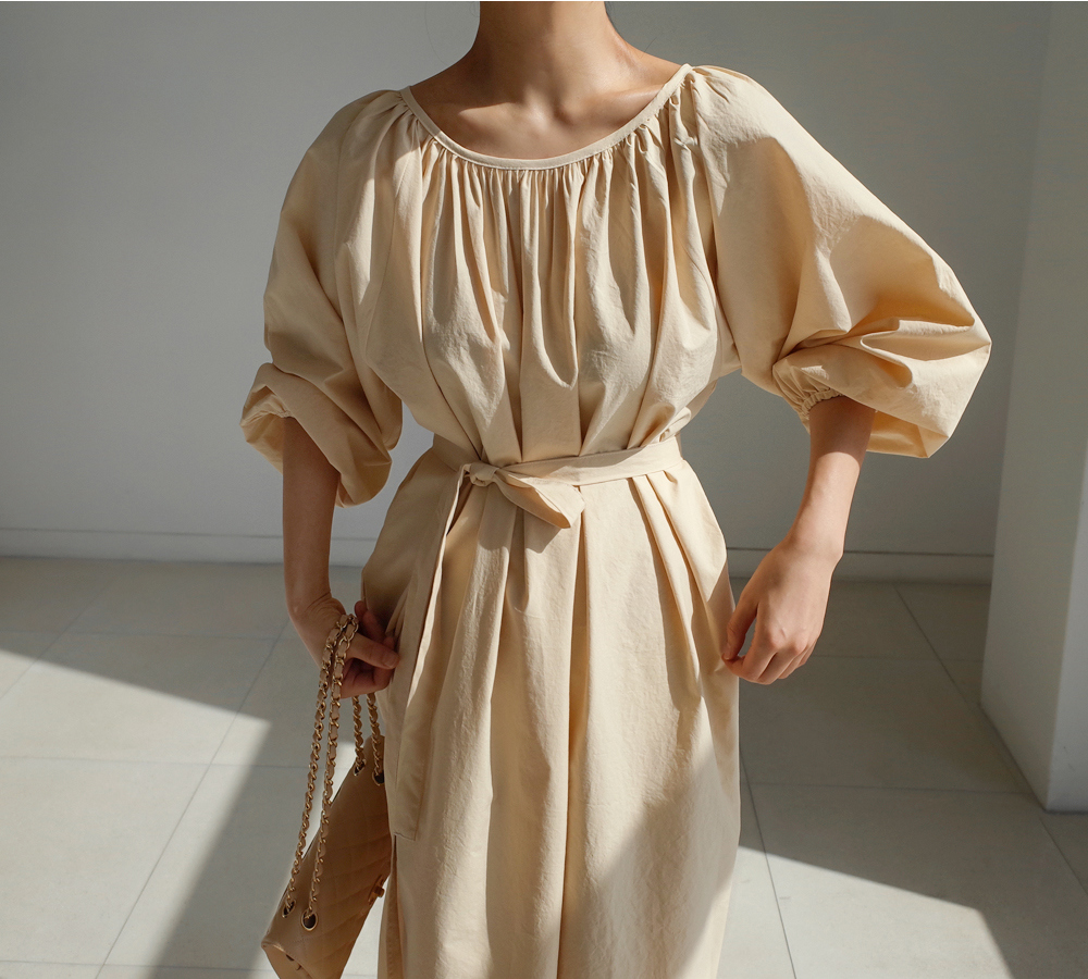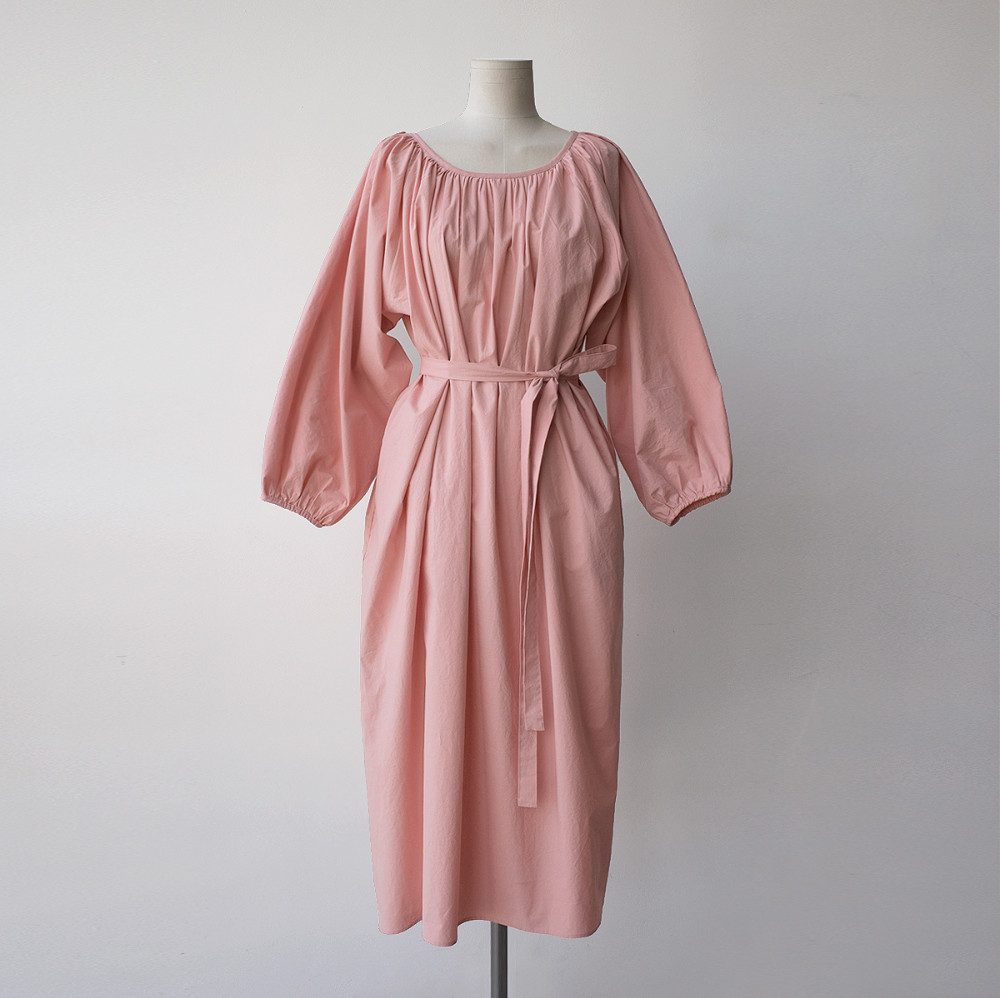 【ワンピース】春秋 ゆったり 大きいサイズ リボン ランタンスリーブ 長袖ワンピース