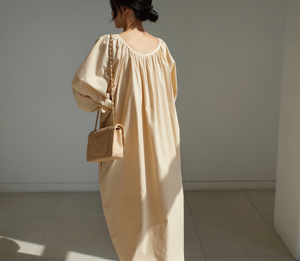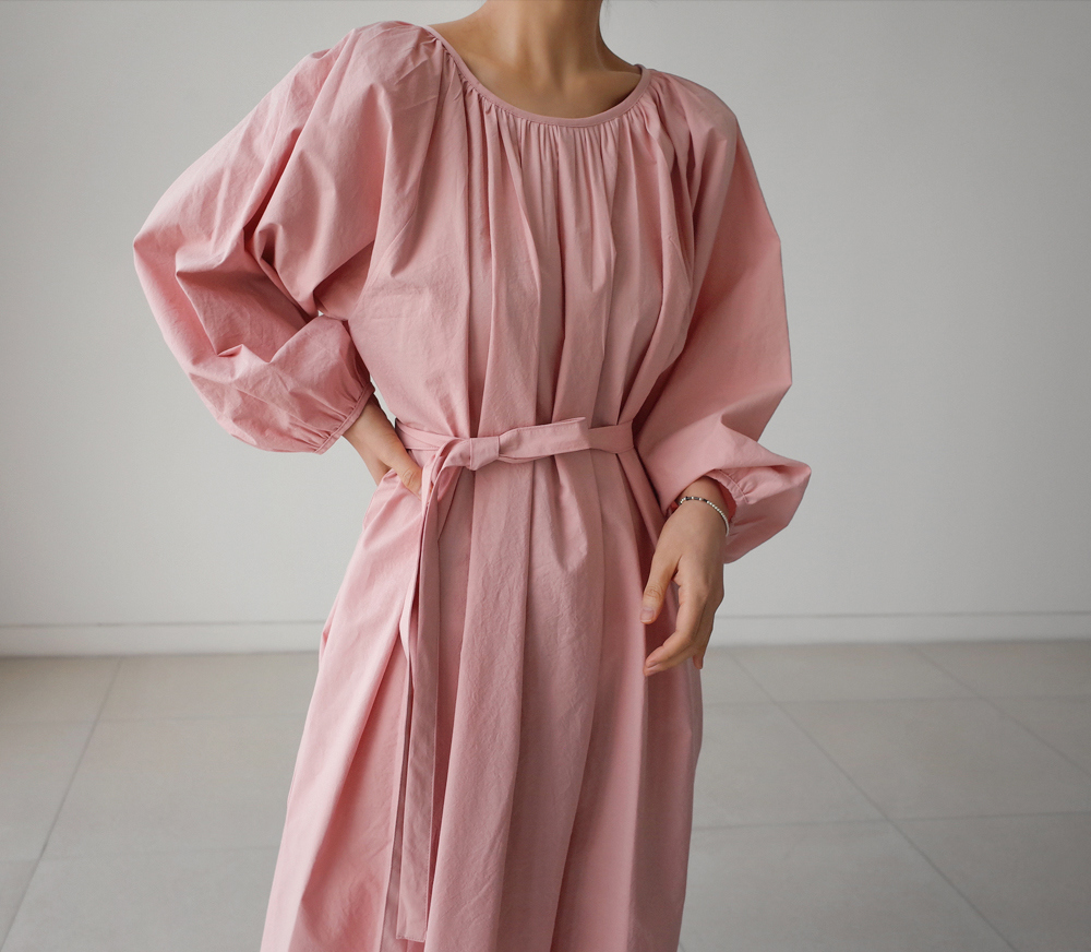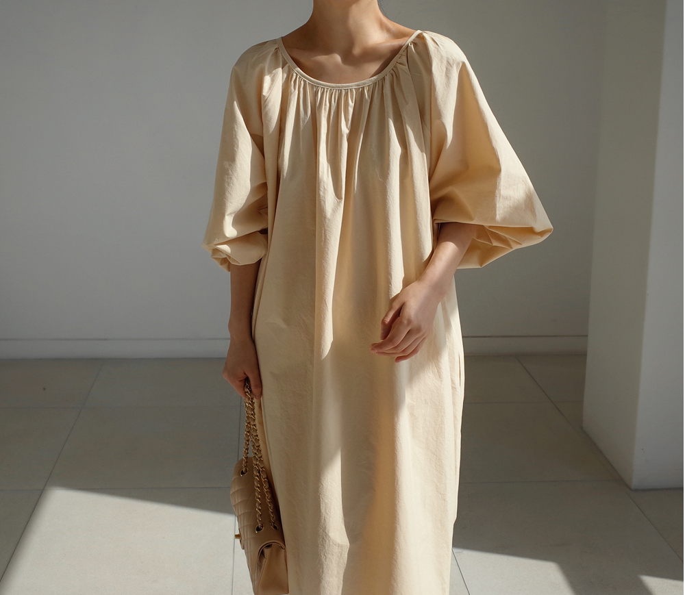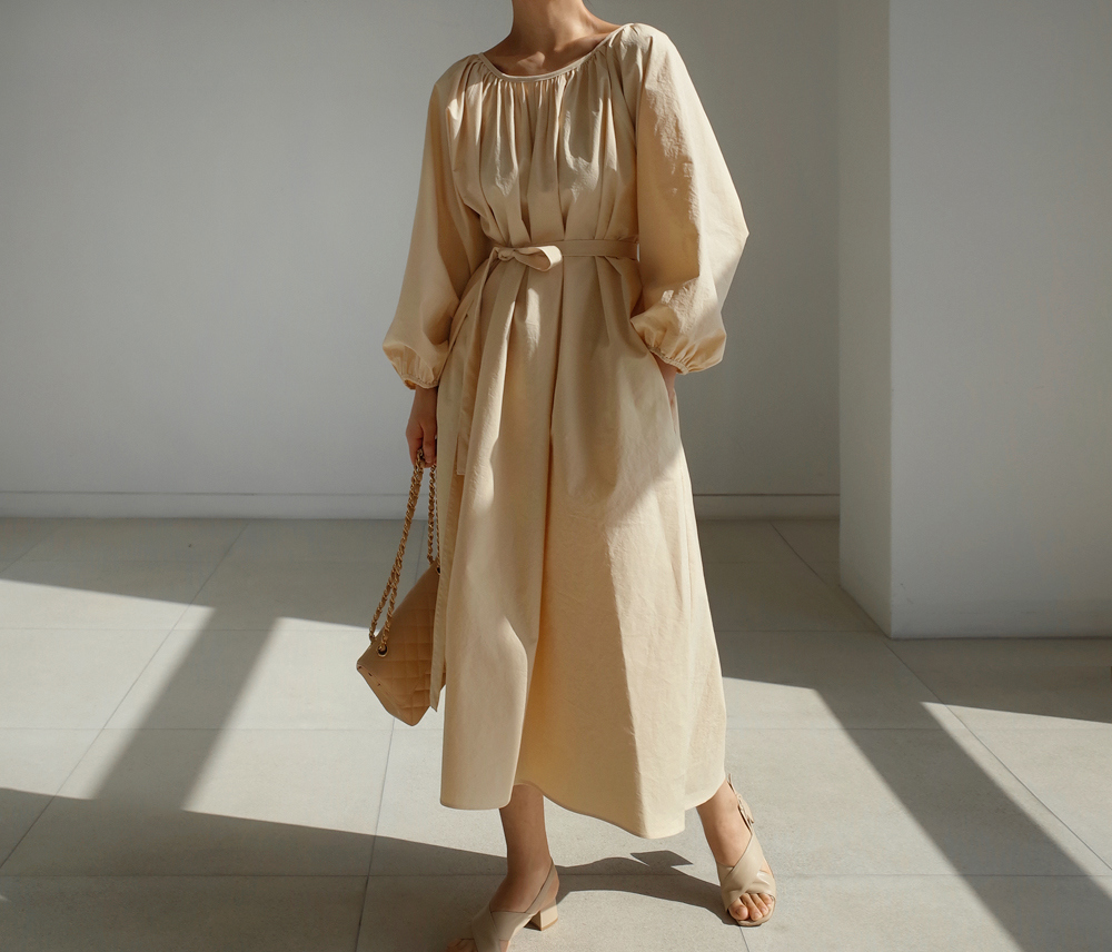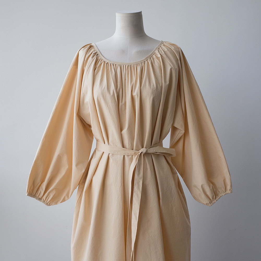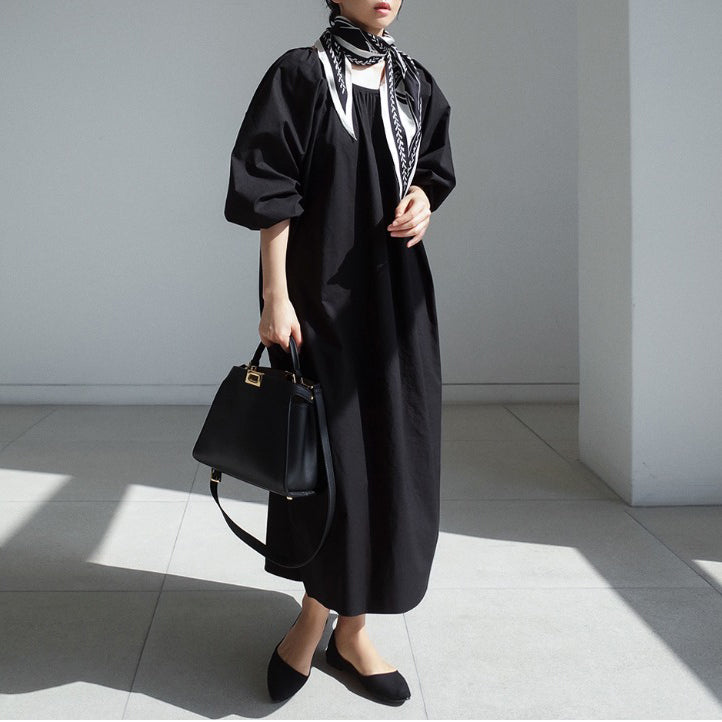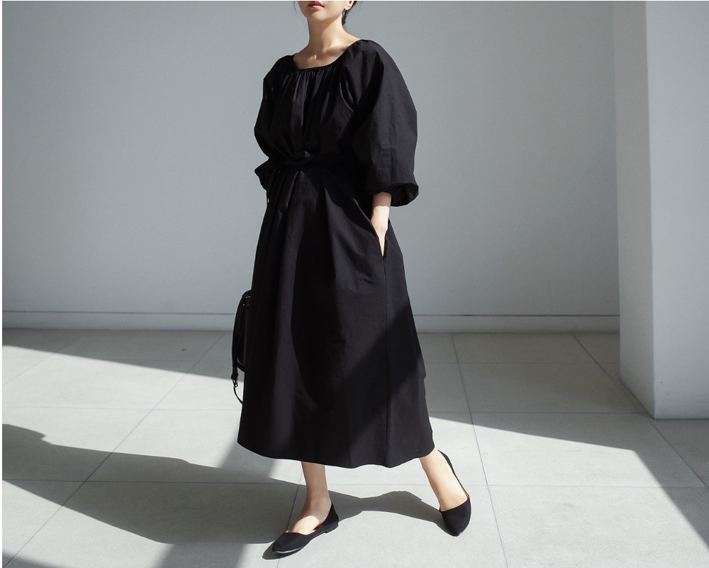 【ワンピース】春秋 ゆったり 大きいサイズ リボン ランタンスリーブ 長袖ワンピース